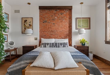 Open-concept loft with bedroom, spa-style bathroom, + a creative studio/workspace. Airy, inspiring, and minimal.
